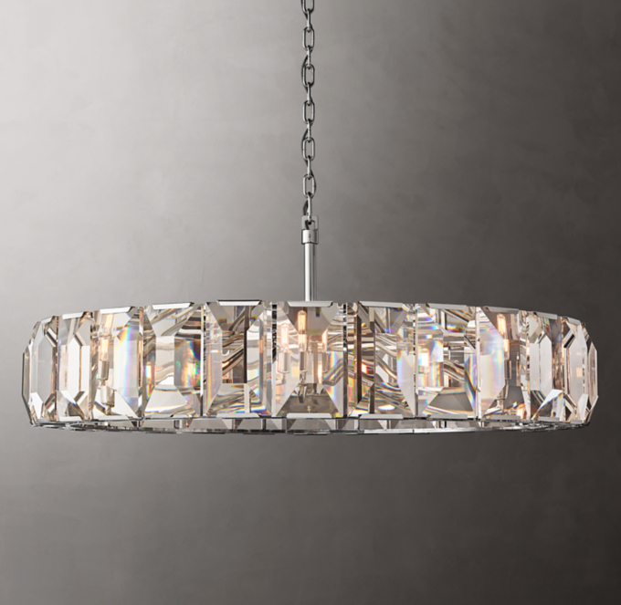 Emerald cut clear glass arranged in round steel frame construction exudes grace and luxury. Pauillac fabric shade round chandelier 48 $ 3695.0 regular $ 2771.0 member + more finishes. Tundra prysm crystal round chandelier. Exquisite harlow style crystal chandelier inspired by a classic german design from the 1970's. Product parameters 【brand】:crispark 【iterm style】:retro 【material】:k9 crystal + metal 【size】:d50 x h45cm d80 x h45cm d110 x h45cm d150 x h45cm 【color】:nickel finish, black finish, brass.